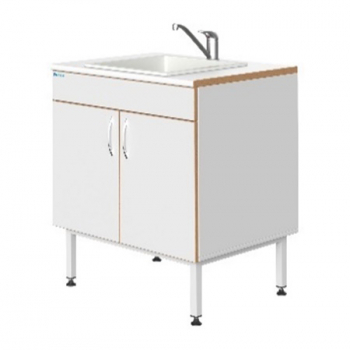 Рабочая поверхность: ламинат с химически стойким пластиковым покрытием с одной врезной чашей из полипропилена. Тумба изготовлена из влагостойкого ДСП. Края срезов закрыты кромочным пластиком ПВХ толщиной 2 мм. Тумба оснащена двумя распашными дверями. Тумба установлена на цельносварной металлический каркас. Каркас изготавливается из стальной профильной трубы и окрашенной эпоксиполиэфирной порошковой краской. Регулируемые опоры. Комплектация мойки: 2 гибкие подводки для воды, сифон, химический смеситель.